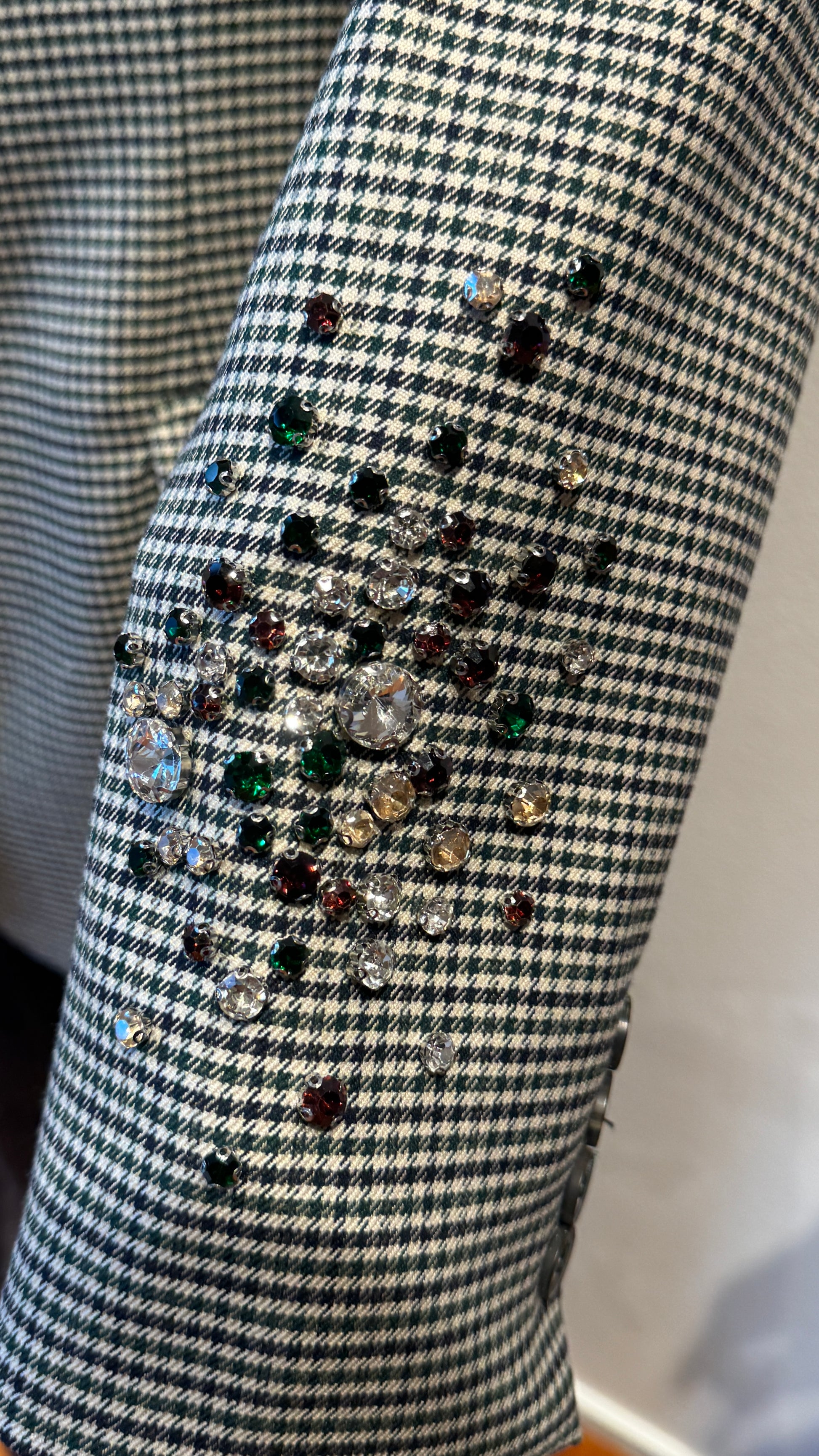 Blazer modello over, in pied de poule verde, blu, panna, con applicazioni di strass multicolor sulle maniche, con tasche sul davanti.