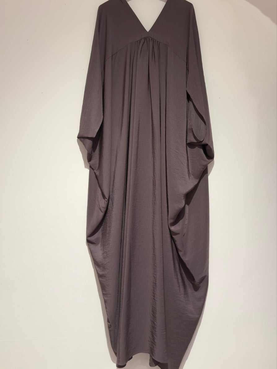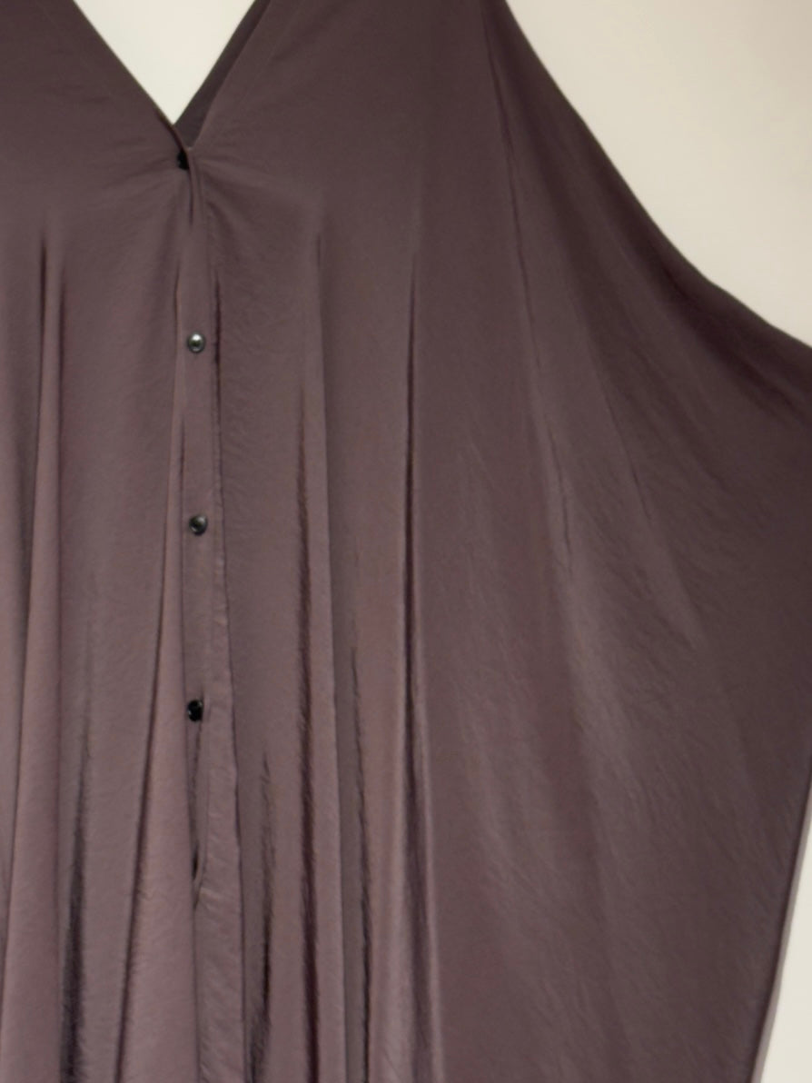 Maxi abito, con fondo irregolare, nel colore malva. Con maniche a pipistrello, chiusura frontale con bottoni e scollo a V.
