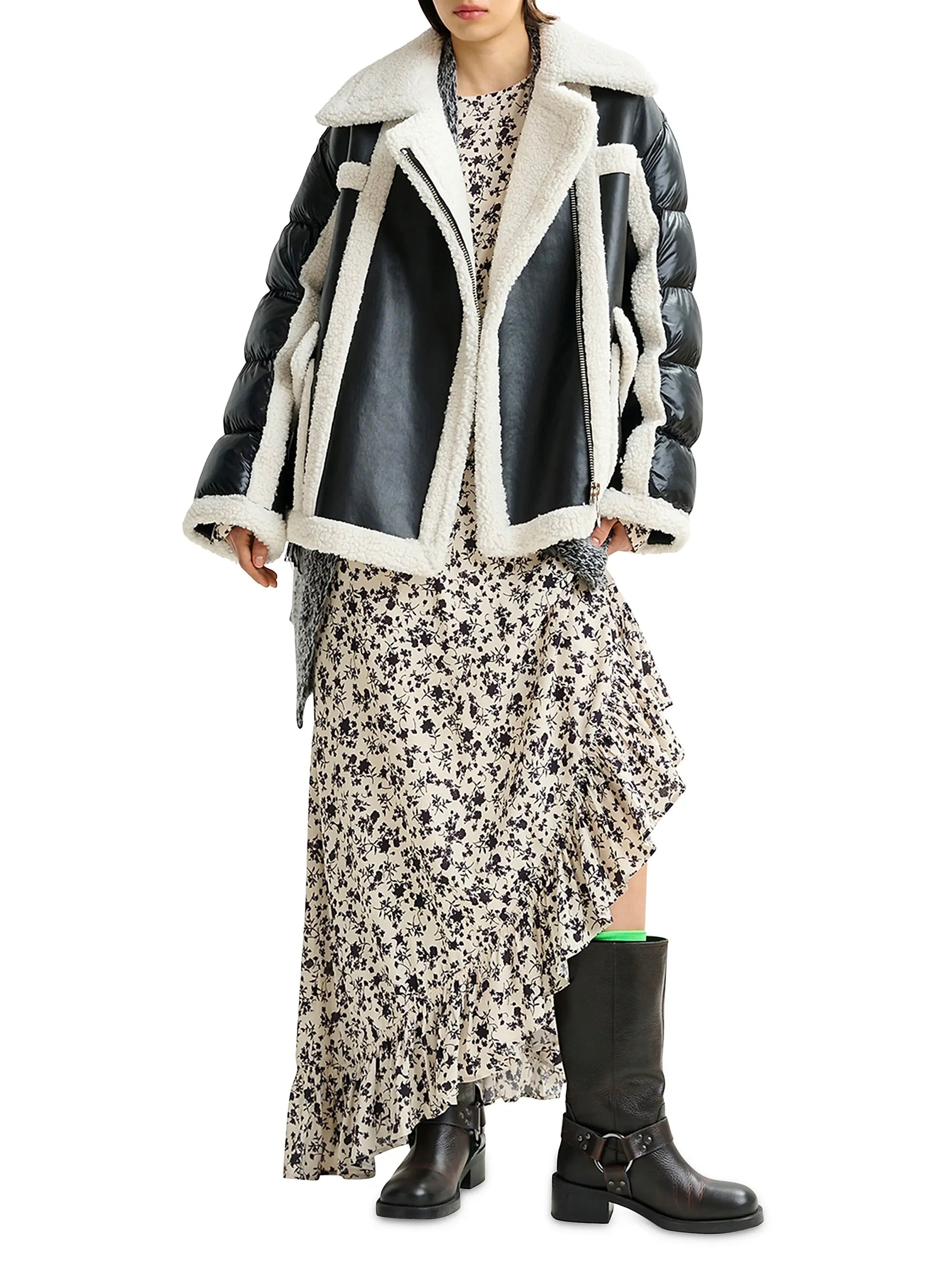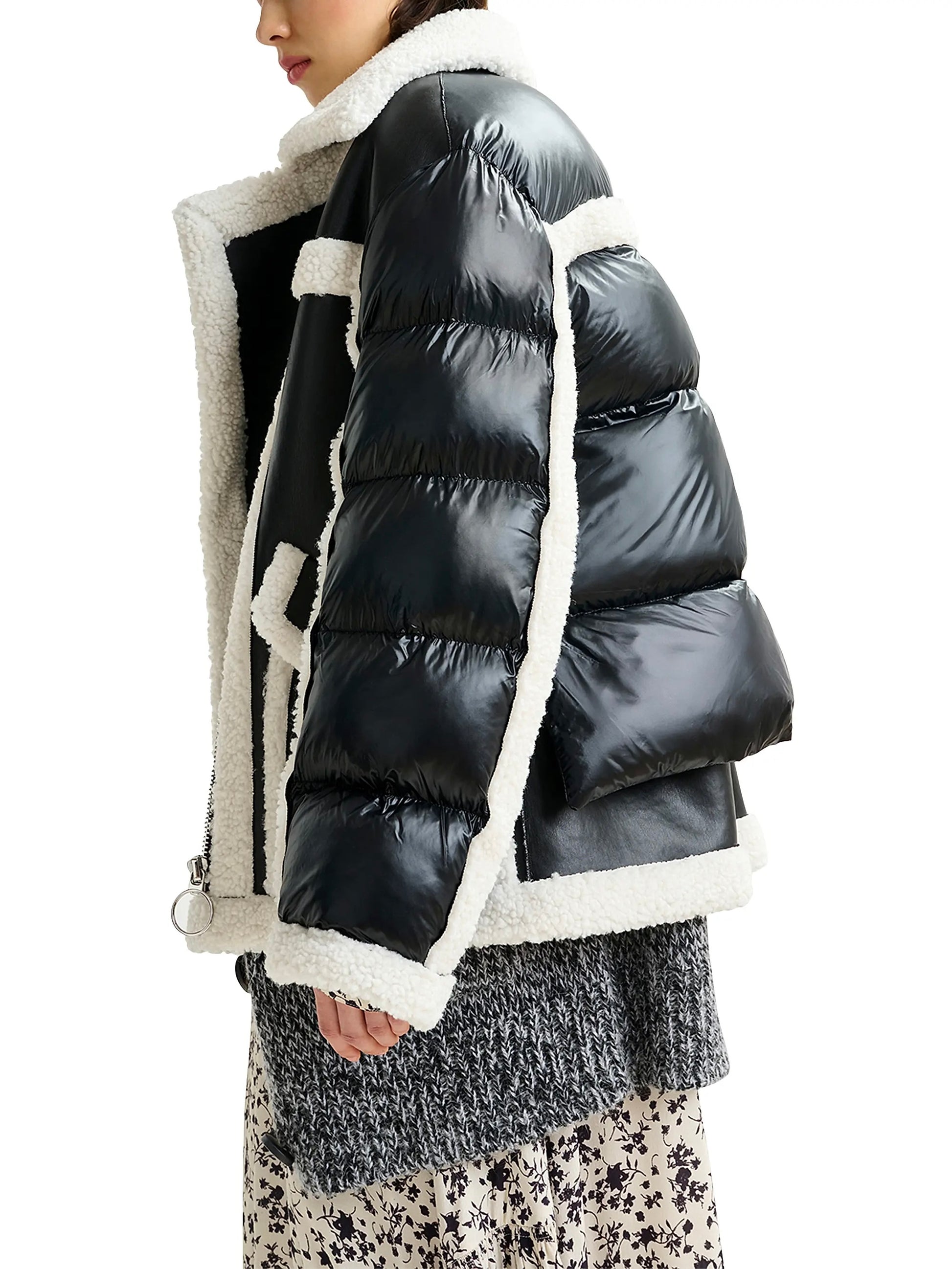 Giacca nei colori nero e bianco, realizzata in finto shearling. Presenta una chiusura con zip frontale asimmetrica e tasche frontali con patta.