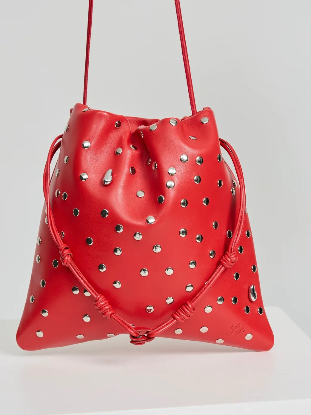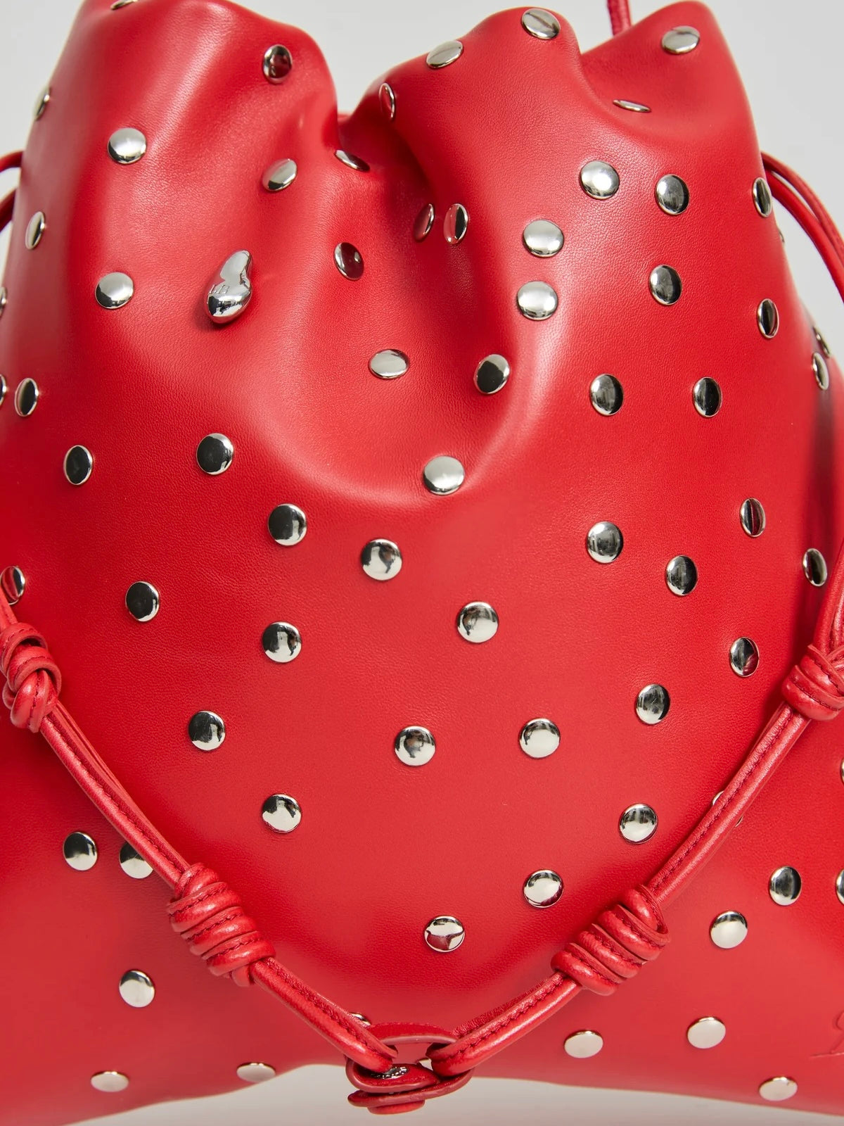 Borsa a tracolla in pelle rossa, con coulisse e dettagli borchiati argento.