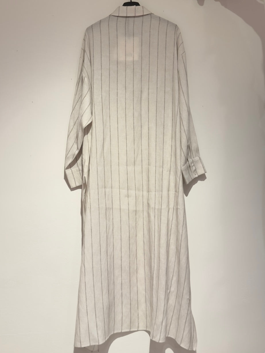 Abito camicia, dal motivo a righe, nel colore ecru. Presenta fondo irregolare, spacco sui lati, con tasca frontale.