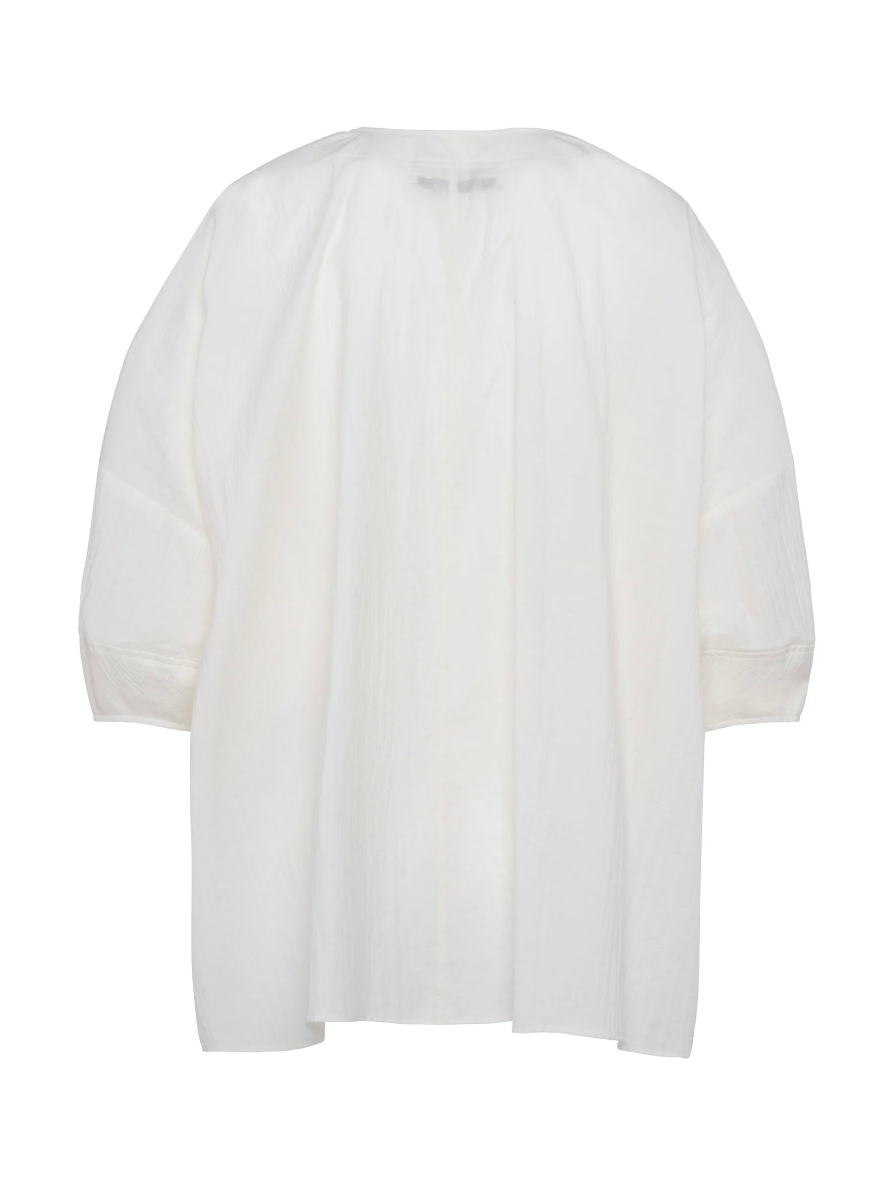 Camicia oversize con maniche a 3/4, nel colore bianco puro, tessuto di cotone stropicciato, con scollo rotondo e bottoni frontali.