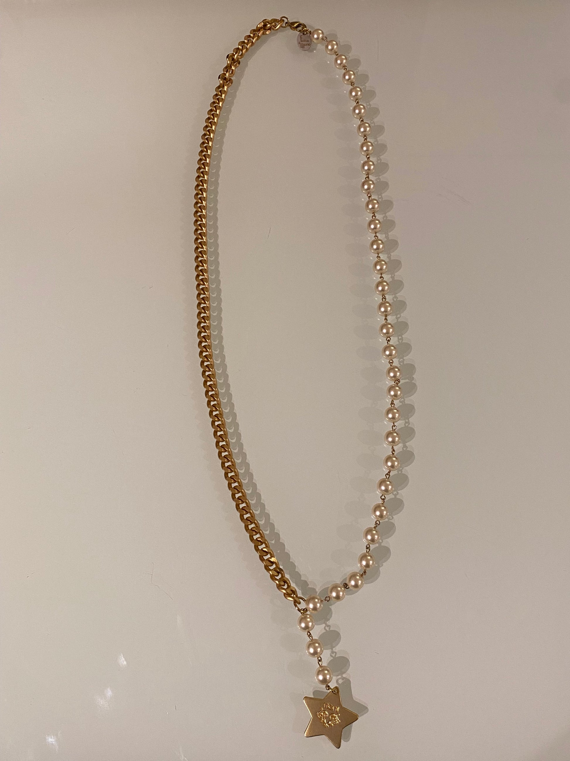 Collana realizzata a mano nel colore oro, con perle e ciondolo a stella.