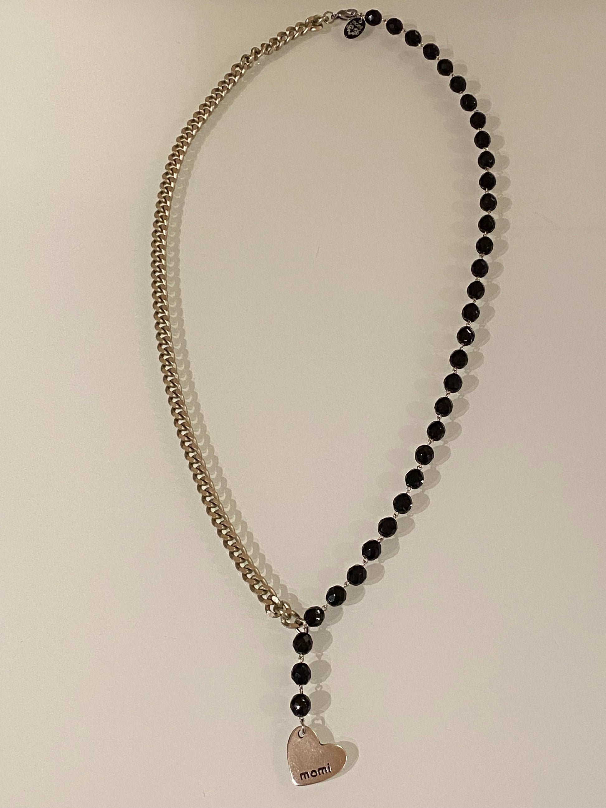 Collana realizzata a mano nel colore argento, con cristalli nel colore nero e ciondolo a cuore.
