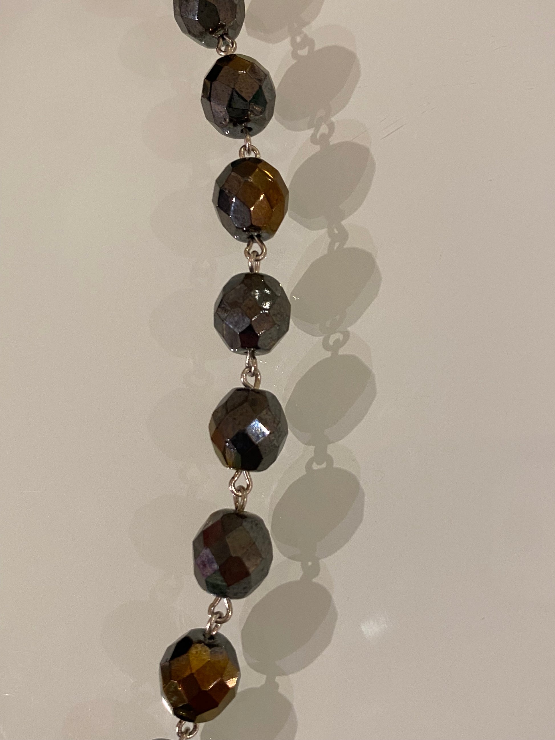 La catena è realizzata in alluminio anodizzato nel colore argento, mentre i mezzi cristalli di vetro hanno un diametro di 1cm e sono incatenati tra loro a mano con anelli in ottone galvanizzato.