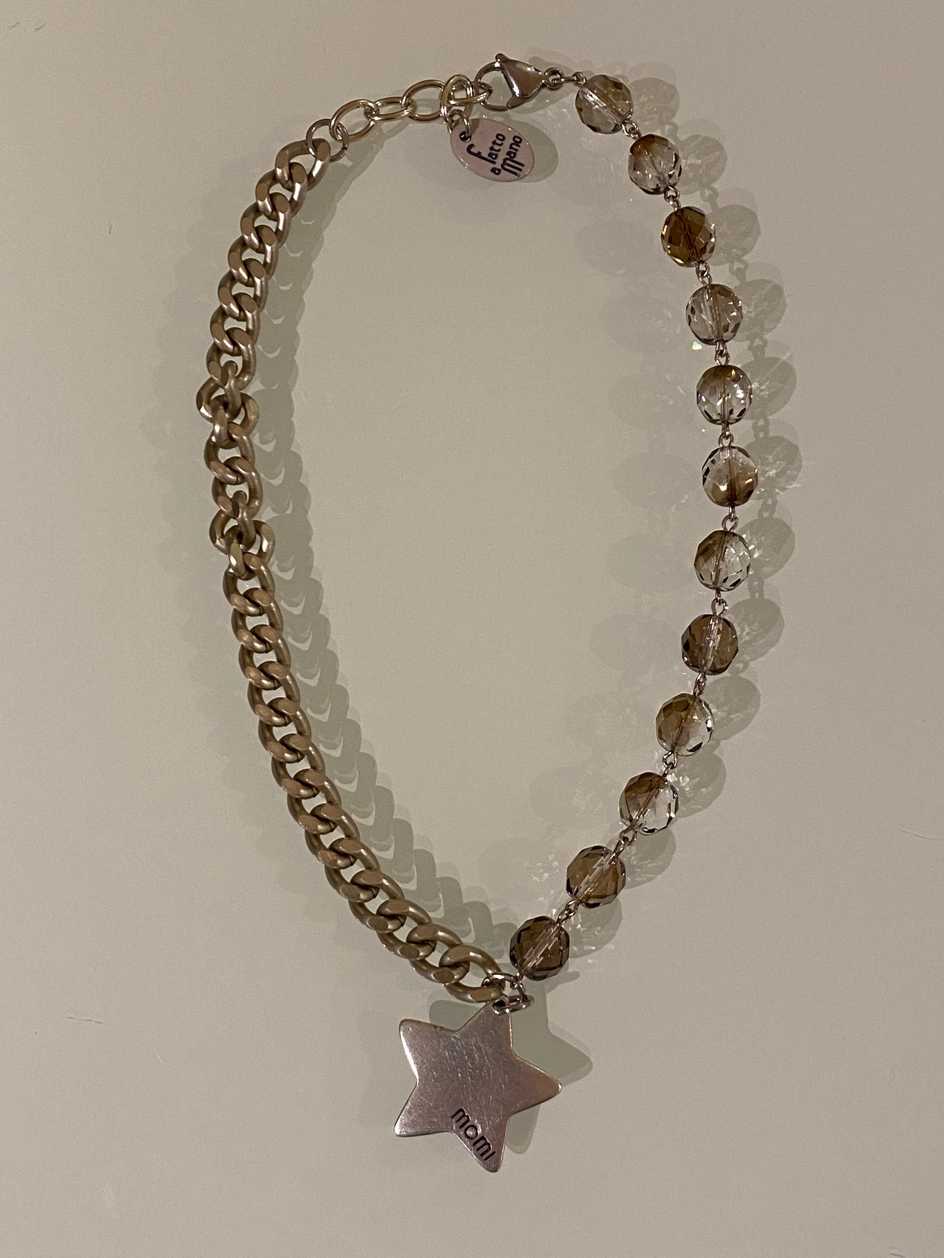 Collana corta realizzata a mano nel colore argento, con cristalli nel colore champagne e ciondolo a stella. Può essere utilizzata anche come bracciale.