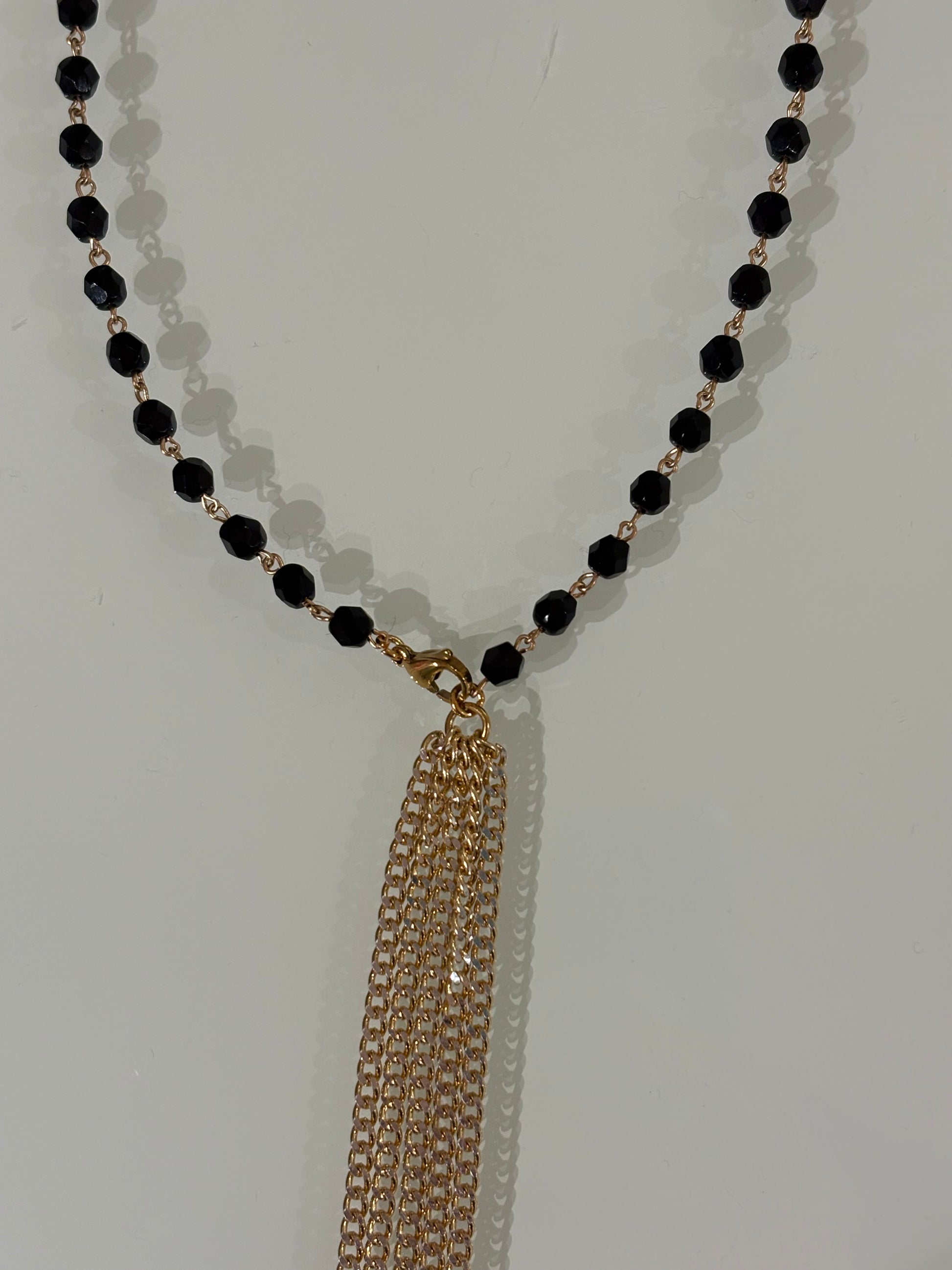 Collana con cristalli nel colore nero, impreziosita da una cascata di frange a catena, realizzata a mano.