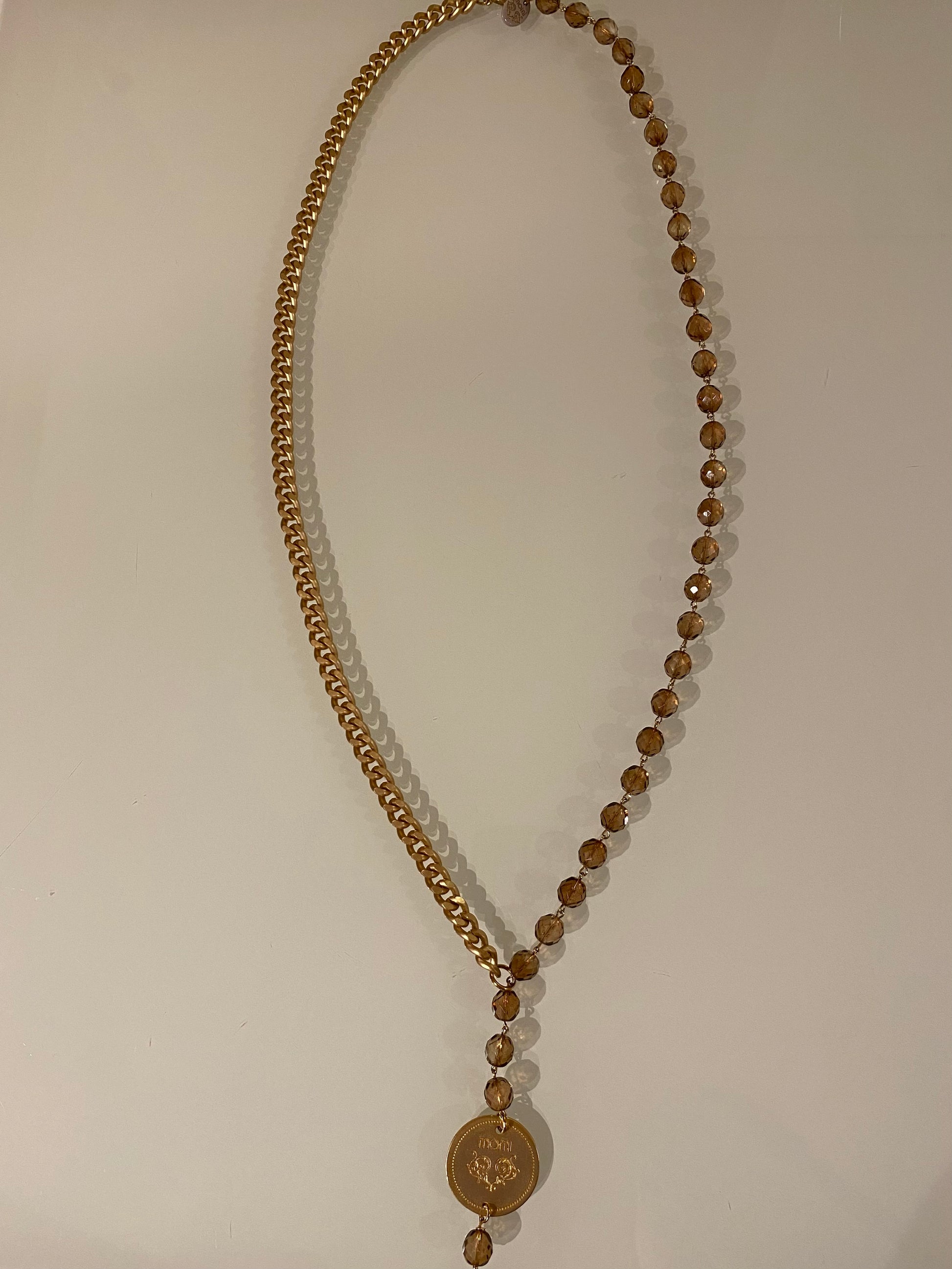 Collana realizzata a mano nel colore oro, con cristalli nel colore ambra e ciondolo rotondo.