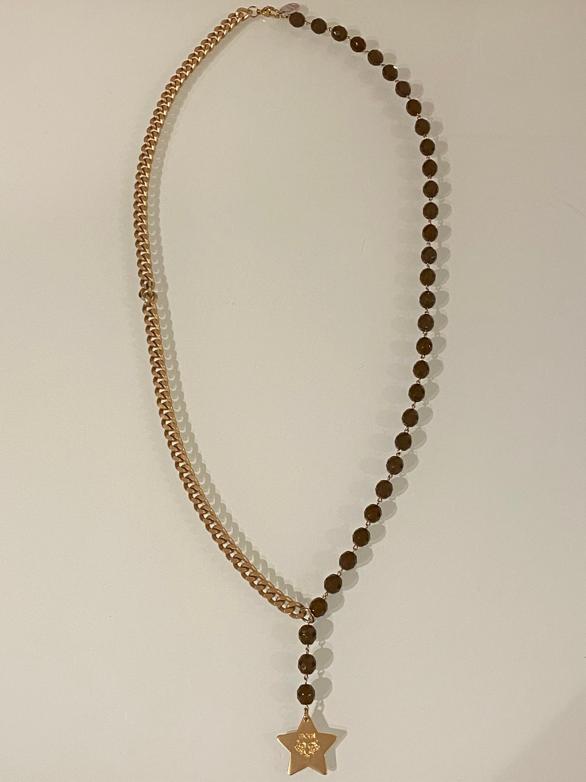 Collana realizzata a mano nel colore oro, con cristalli nel colore marrone e ciondolo a stella.