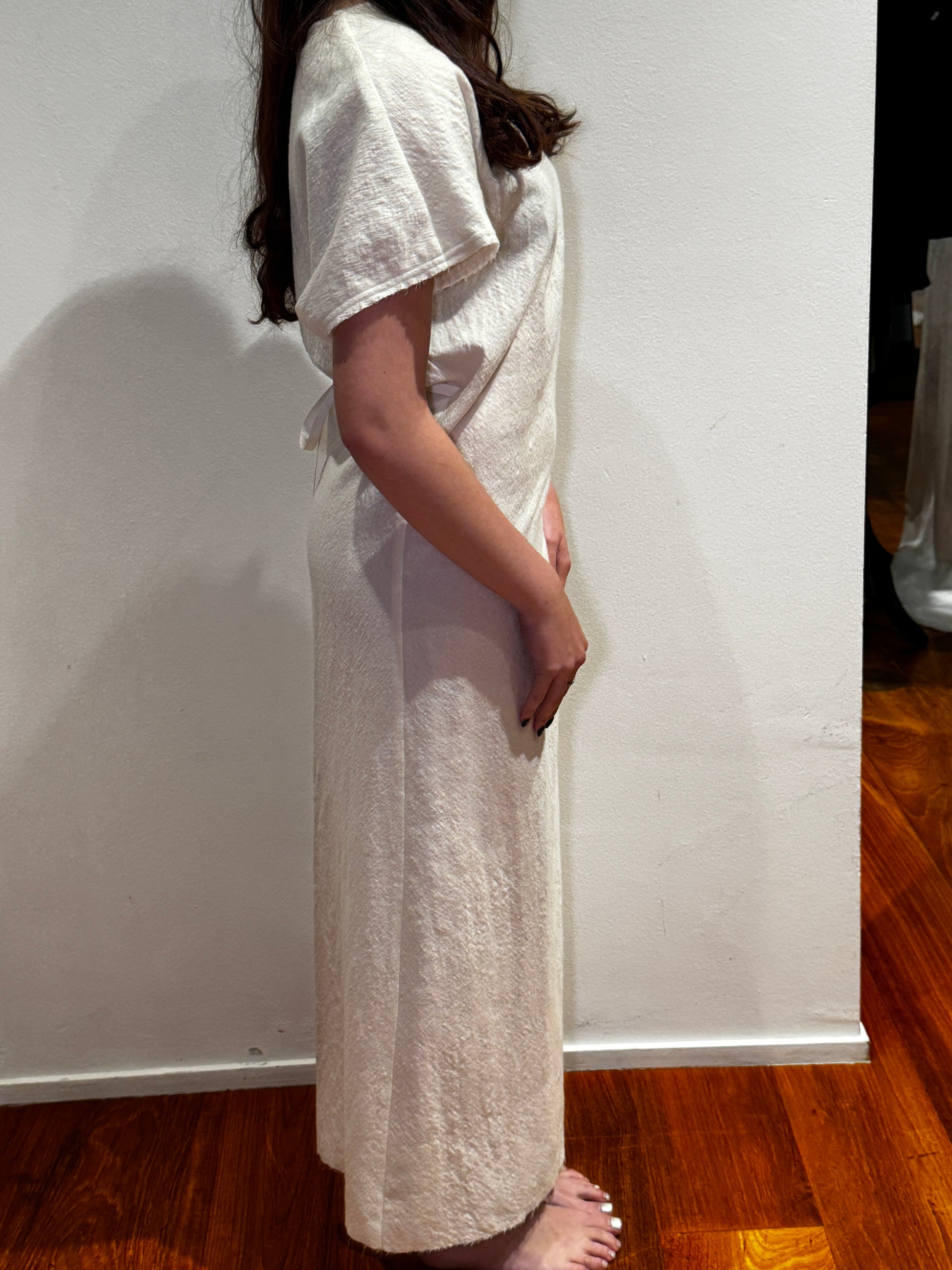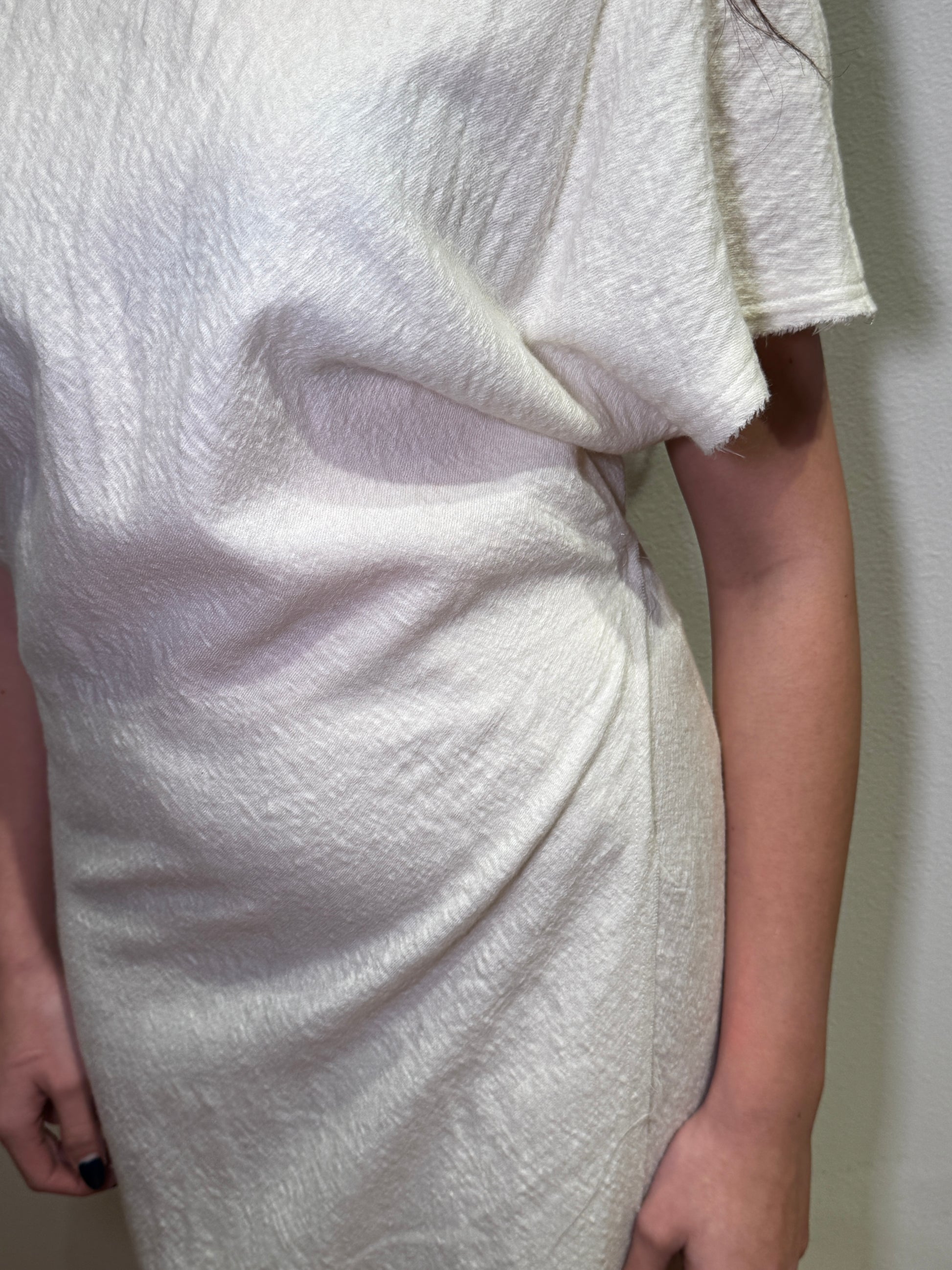 Abito girocollo nel colore riso, effetto stropicciato, smanicato, con allacciatura sul retro.