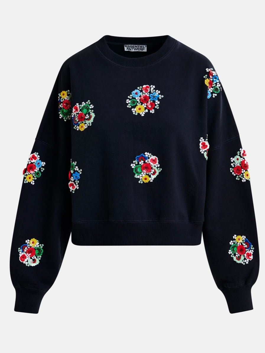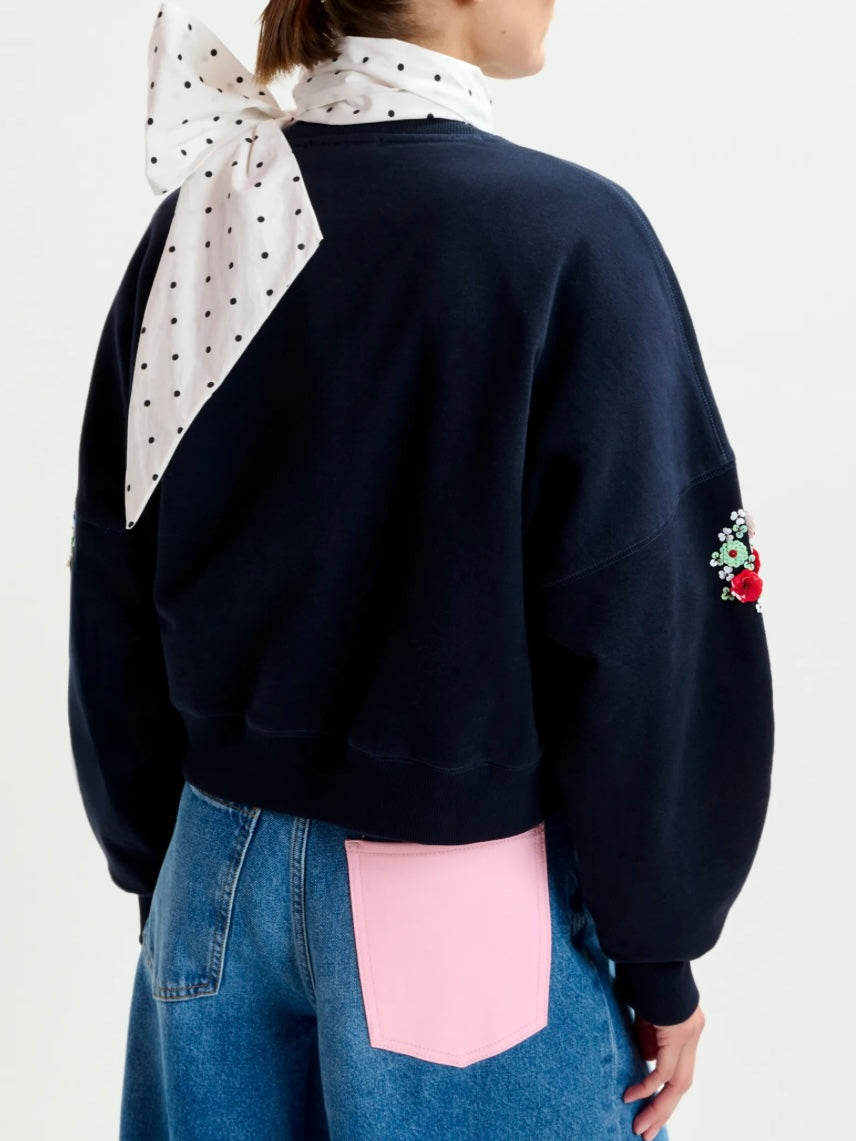 Felpa in cotone nel colore blu navy e multicolore, con ricami floreali di paillettes e perline. Presenta un tessuto di spessore medio, leggermente elasticizzato.