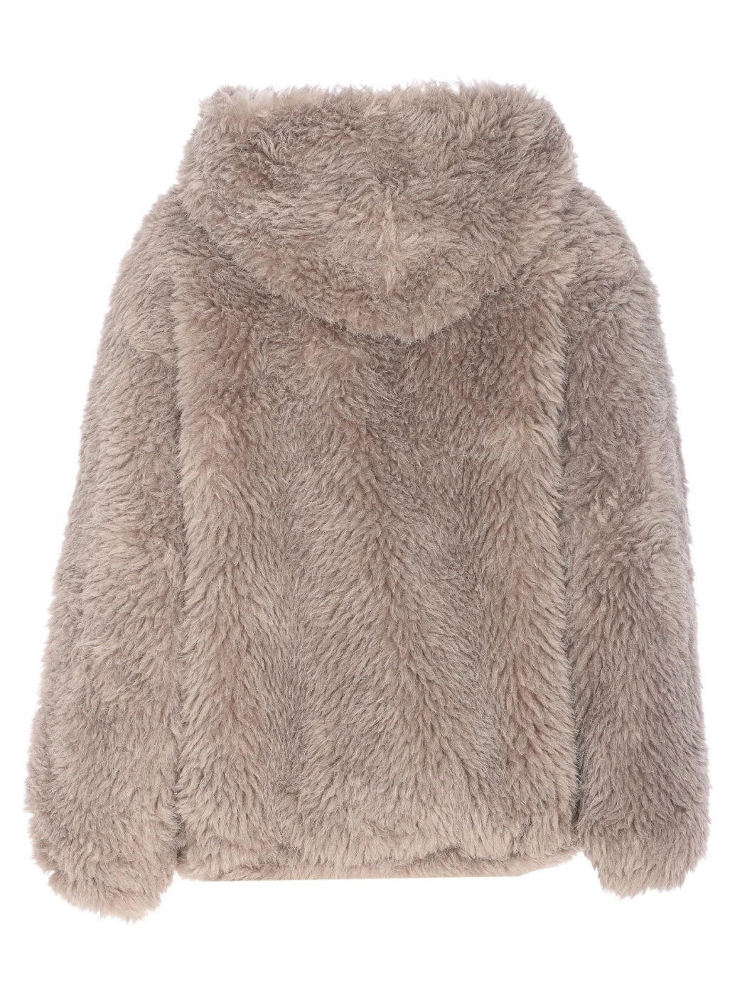 Ecopelliccia nel colore grigio, dalla chiusura con zip, tasche laterali e cappuccio.