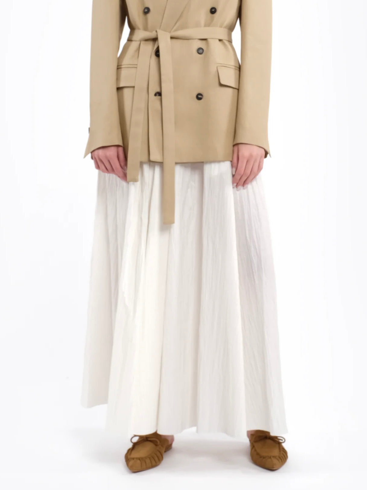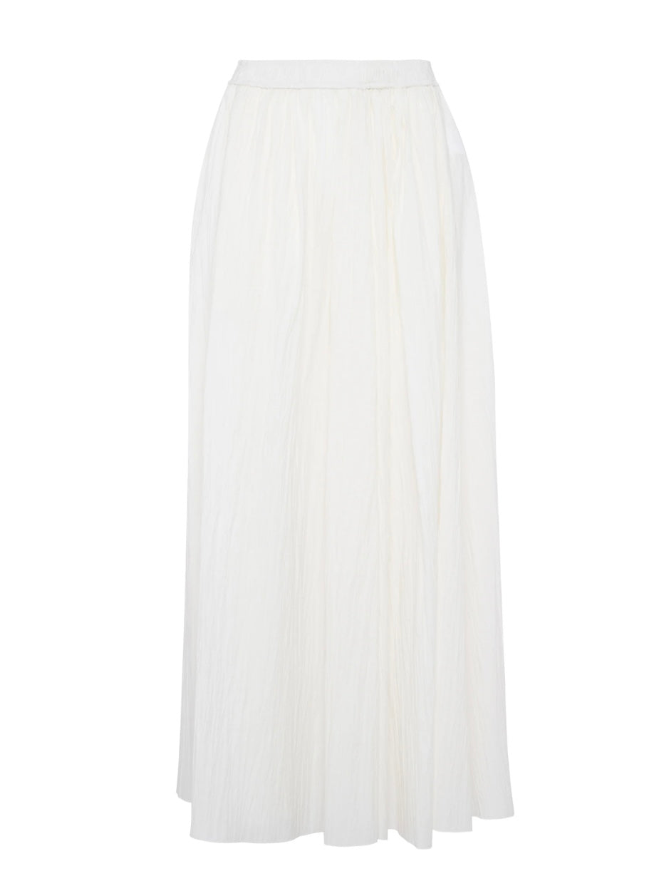 Gonna lunga in cotone stropicciato, con pieghe nel colore bianco puro.
