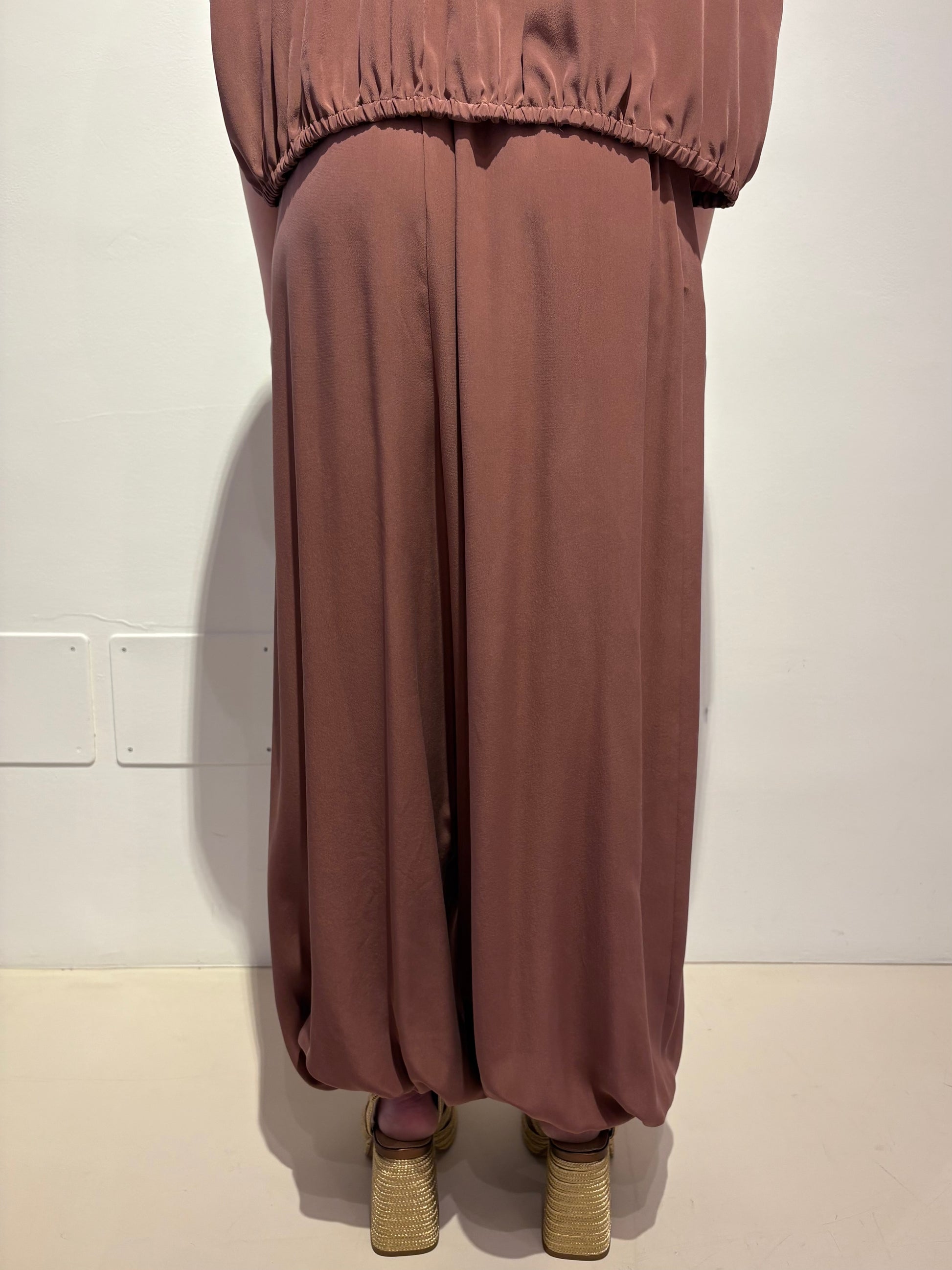Pantalone in seta, nel color blush. Dal taglio a balloon, con elastico in vita e alle caviglie. Tasche laterali.
