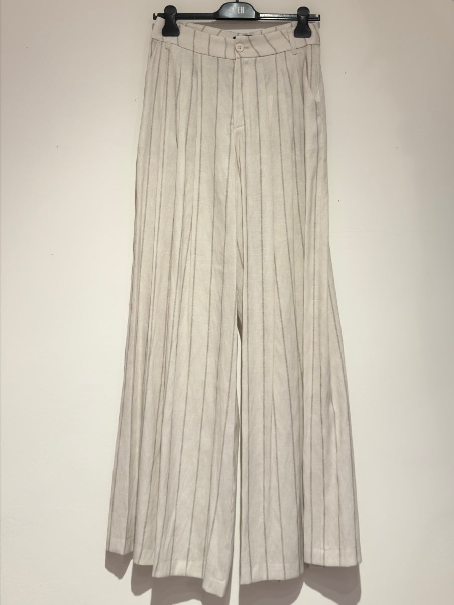 Pantalone dalla vestibilità morbida, dal motivo a righe nel colore ecru. Con passanti per cintura, tasche laterali e chiusura con zip e bottone.