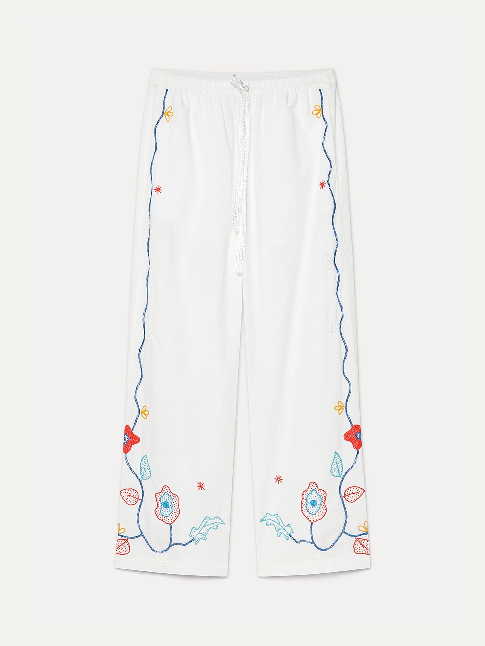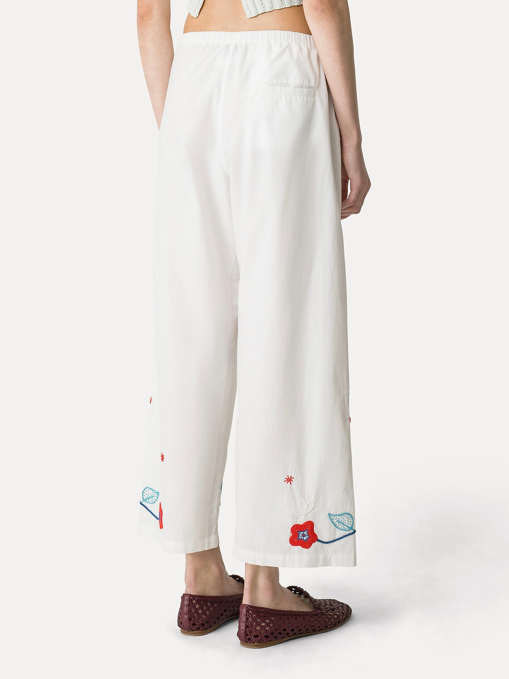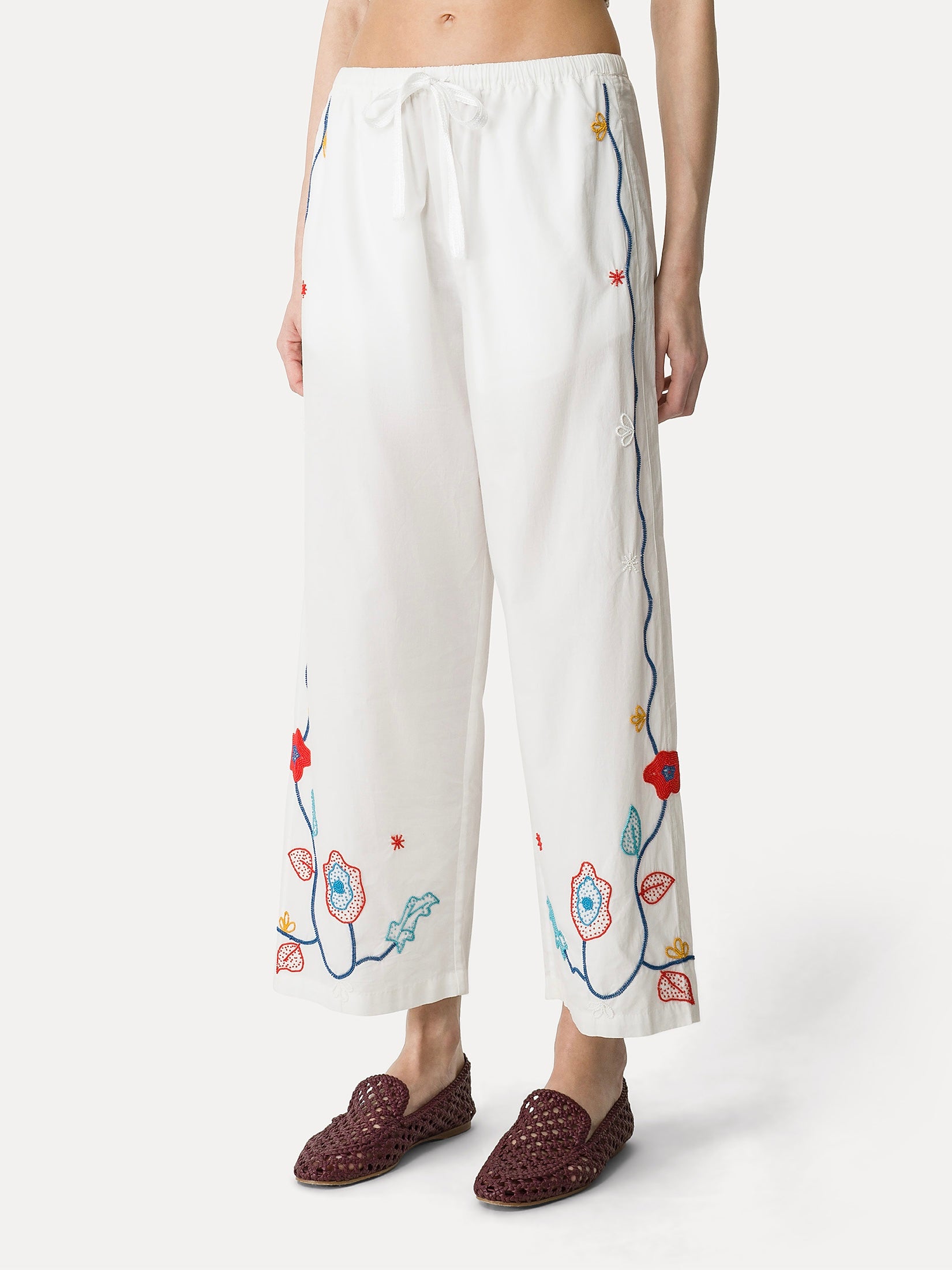 Pantalone in cotone nel colore bianco, con ricamo colorato con perline e ramage ricamati a filo. Con coulisse e nastro tressé in vita. Fondo in cotone chic completato da corolle e stelline, in un tripudio romantico.