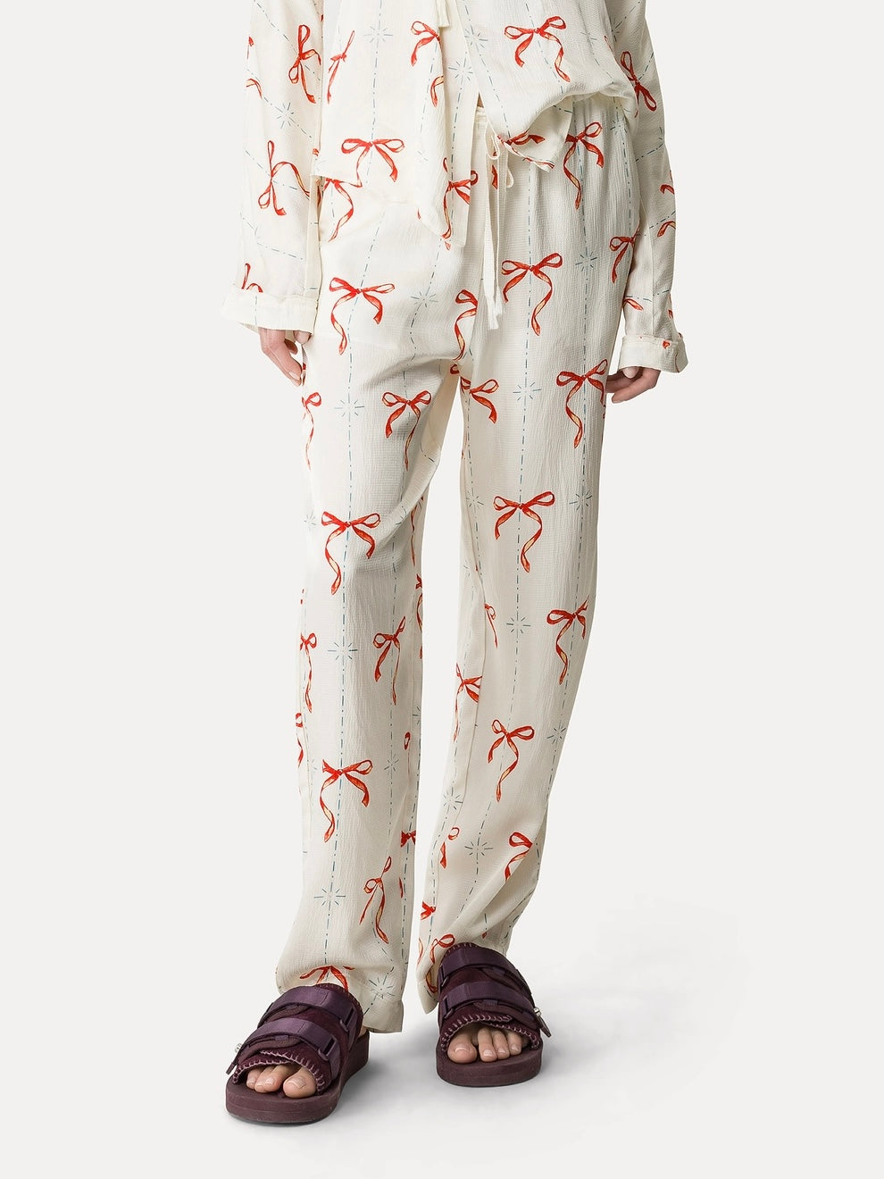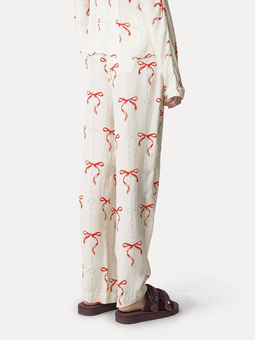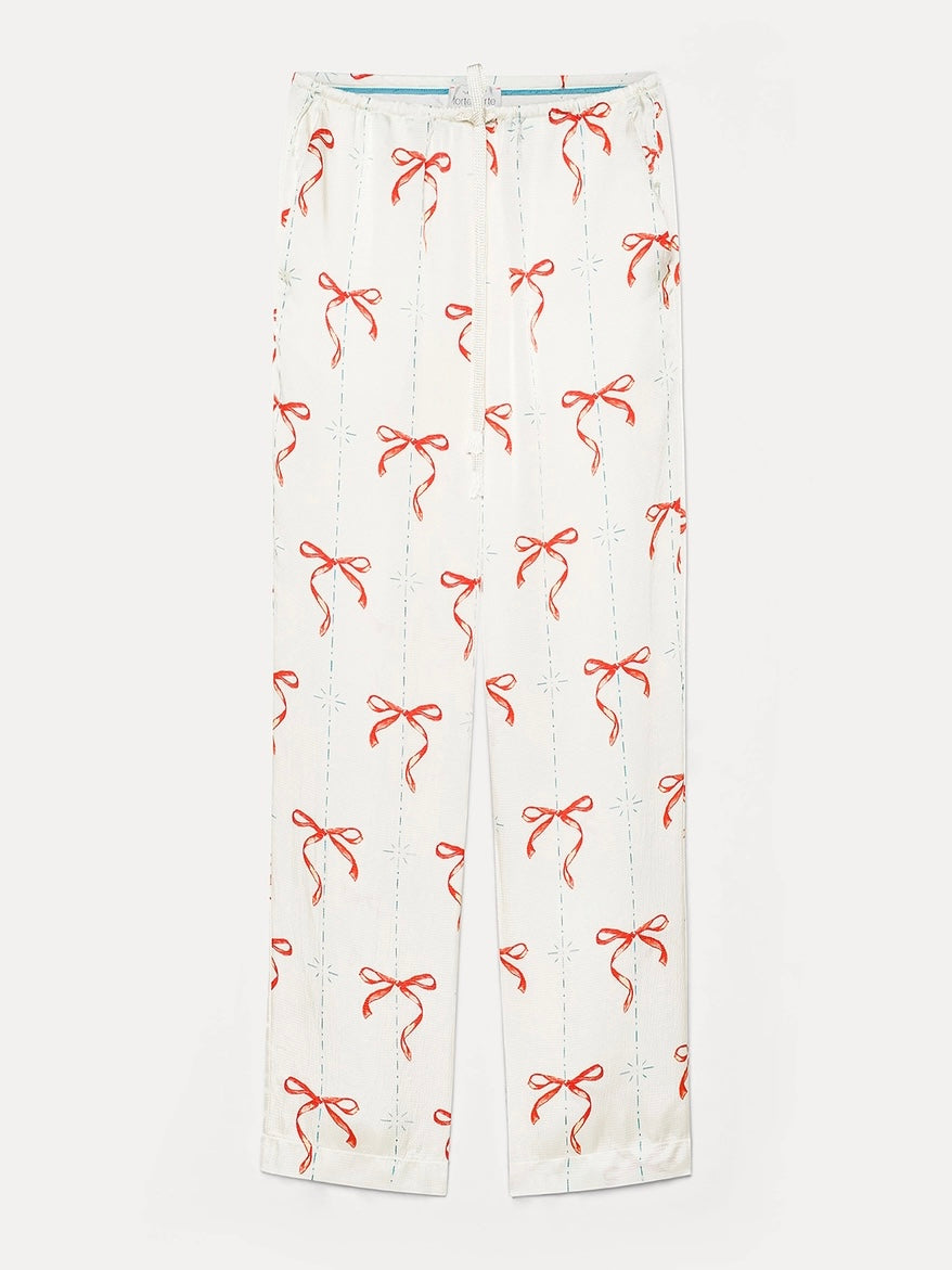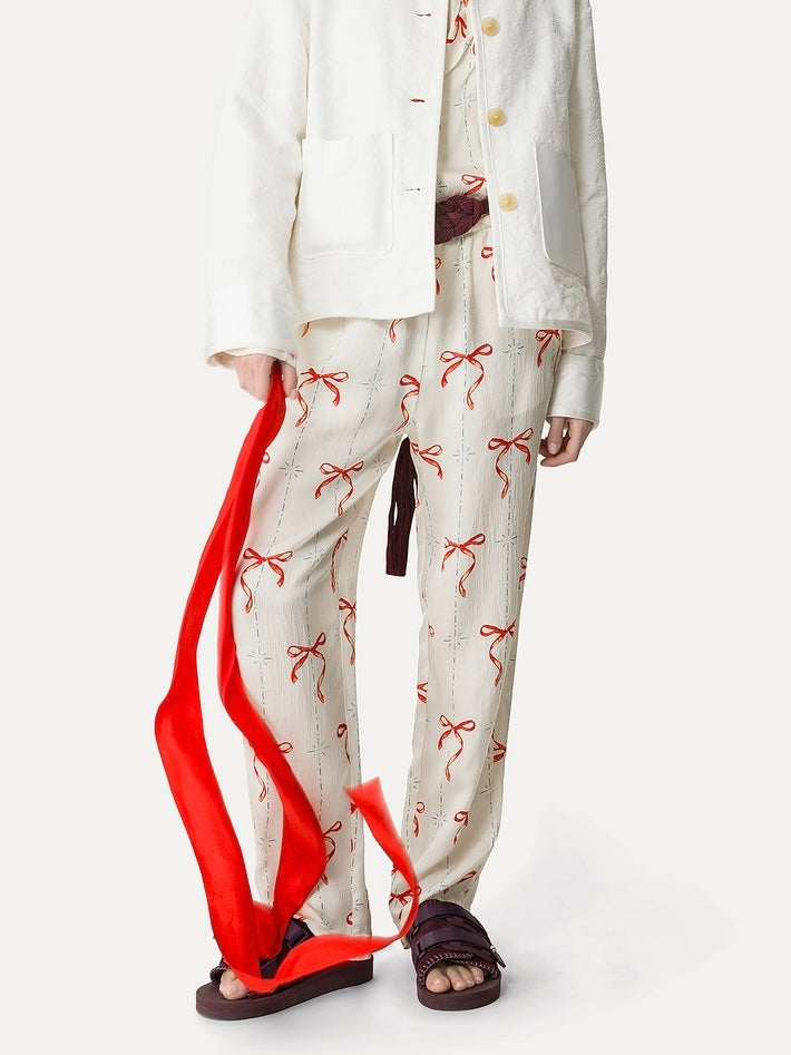 Pantalone in raso nel color crema, con linea morbida sulla gamba e un'ironica stampa ispirata a motivi retrò nel color rouge. Coulisse con elastico in vita e nastro tressé. Tasche laterali e tasca posteriore a filetto.