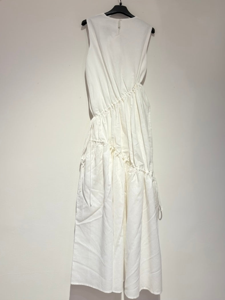 Abito lungo nel colore bianco. Presenta arricciature e fiocchi su tutta la lunghezza.